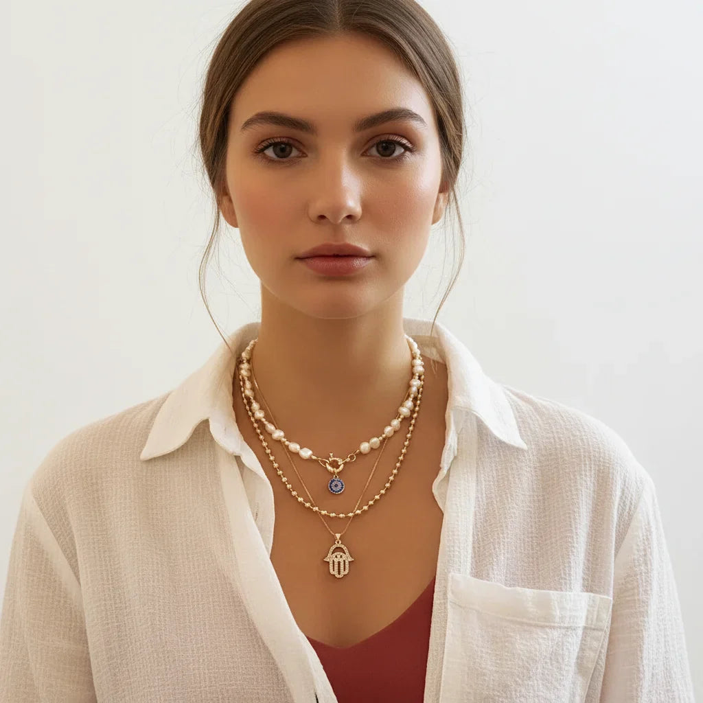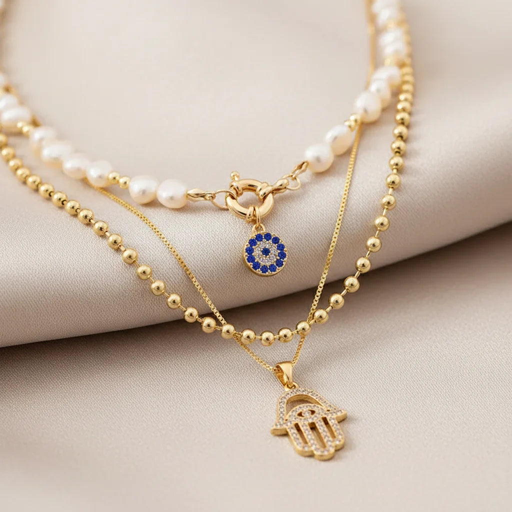 Chaque couche raconte une histoire. Le pendentif œil et la main de Hamsa, sertis de zircons, tissent une aura de protection et de distinction, sublimant votre essence.
